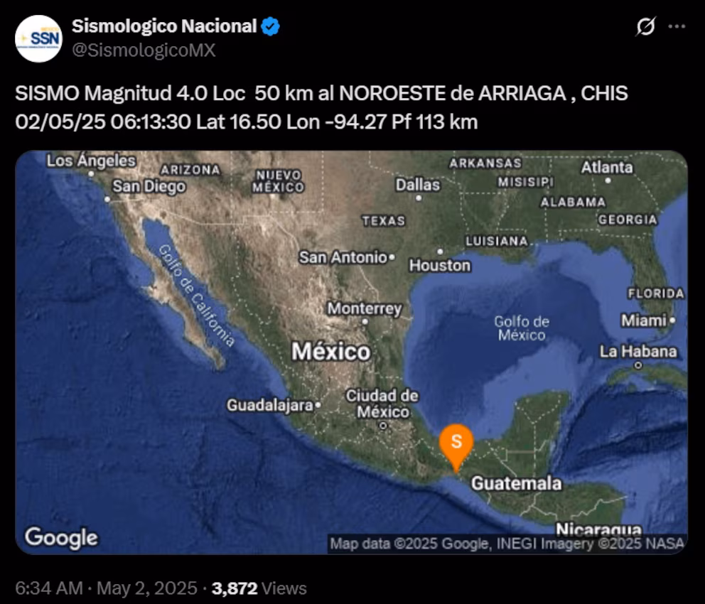 Este viernes 2 de mayo de 2025, a las 6:13 a.m., se registró un sismo de magnitud 4.0 en el estado de Chiapas, según el reporte del Servicio Sismológico Nacional (SSN). El epicentro se localizó a 50 kilómetros al noroeste de Arriaga, con una profundidad de 113.9 kilómetros.